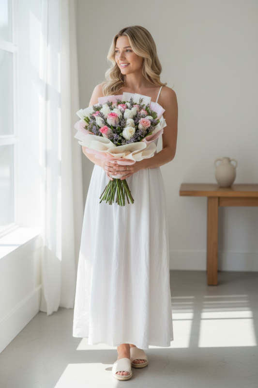 20pc Jamila Pink & White Rose Harmony Bouquet