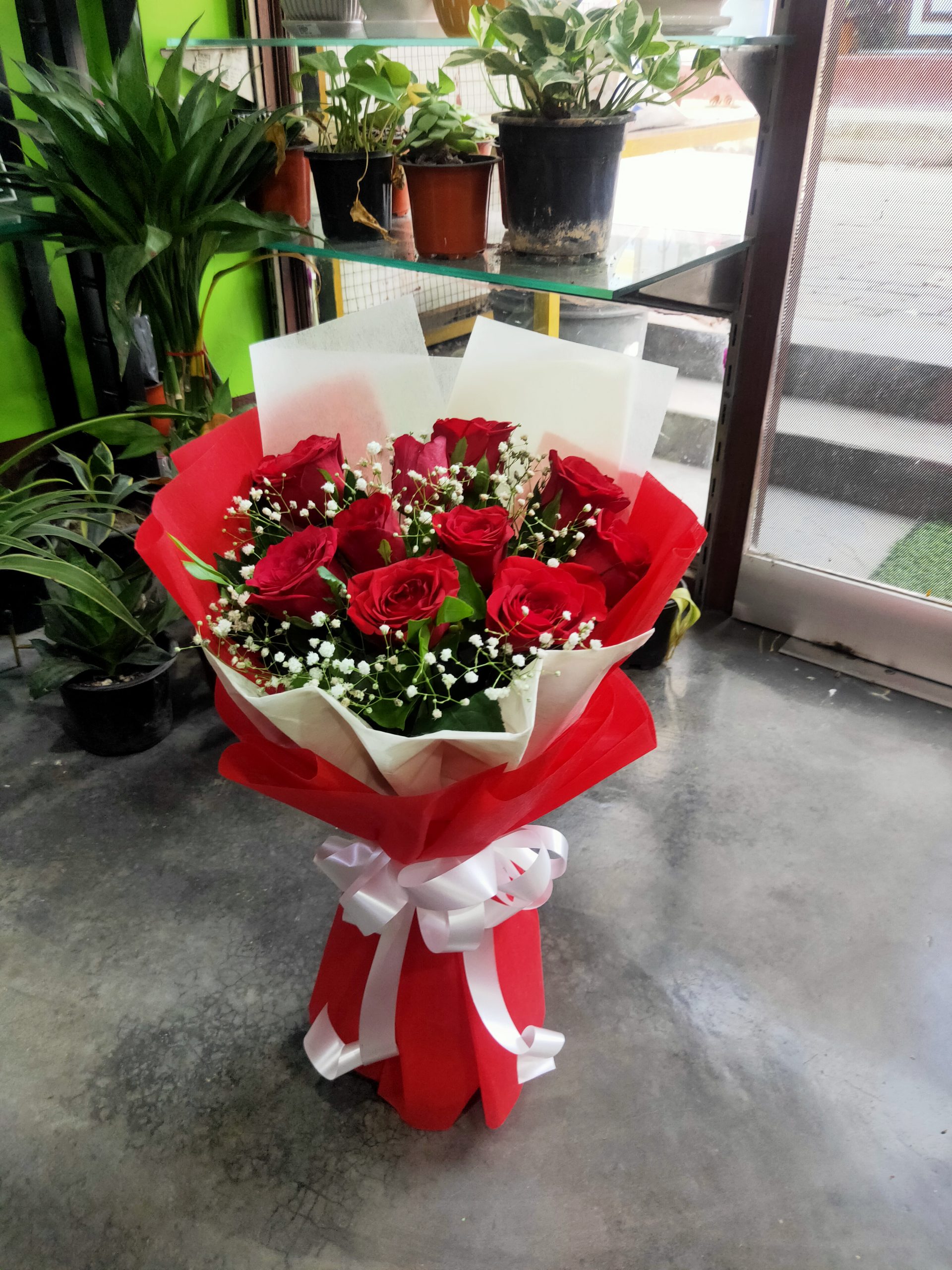 A romantic bouquet of fresh red roses with baby’s breath, elegantly wrapped—perfect for expressing love and passion.