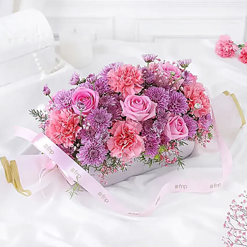 The Pastel Charm Blooms & Pineapple Cake Combo features a breathtaking arrangement of pastel-colored roses, carnations, and chrysanthemums — styled beautifully with satin ribbons. Paired with a moist, creamy pineapple cake decorated in a vibrant watercolor design, this combo speaks the language of love effortlessly.