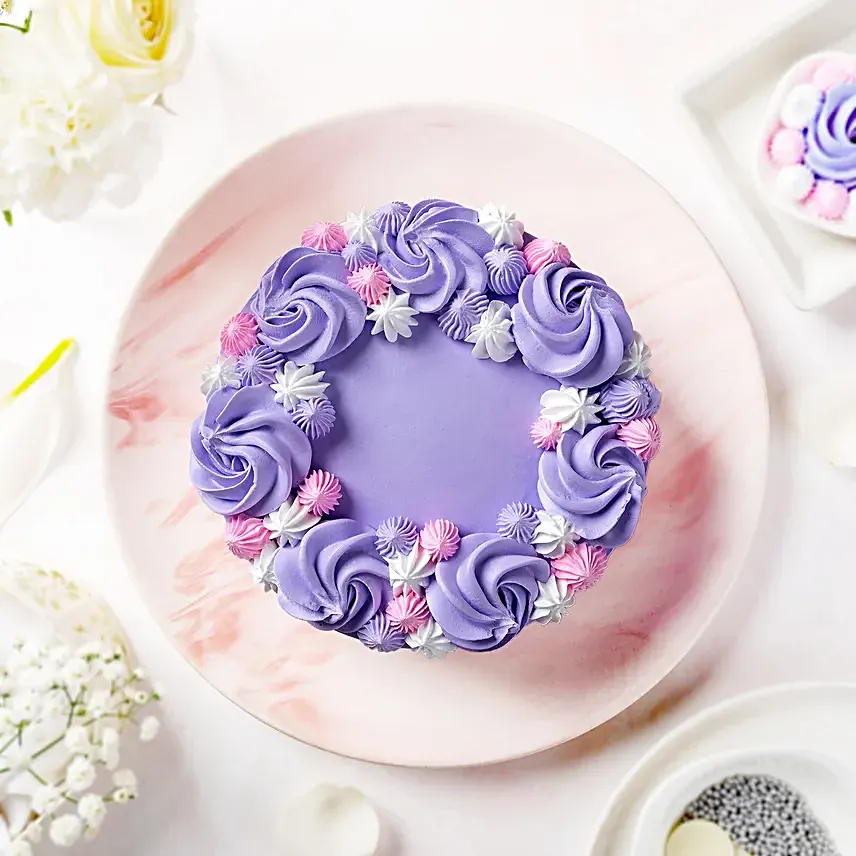 This half-kg eggless cake is layered with delicious chocolate sponge and smooth cream frosting, finished with a gorgeous swirl pattern in lilac, white, and pink.